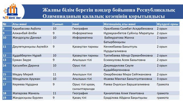 13 апрель 2022 0 1 2 3 4 5 Жалпы білім беретін пәндер бойынша Республикалық Олимпиаданың қалалық кезеңінің қорытындысы